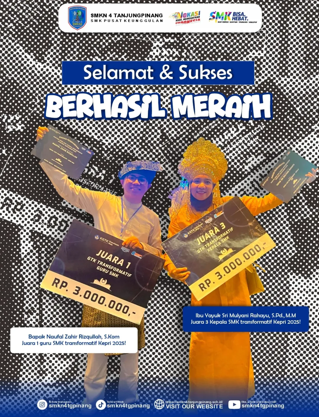 Kami bangga mengumumkan bahwa SMKN 4 Tanjungpinang telah meraih penghargaan bergengsi dalam ajang Penghargaan Guru dan Tenaga Kependidikan (GTK) 2025 Provinsi Kepulauan