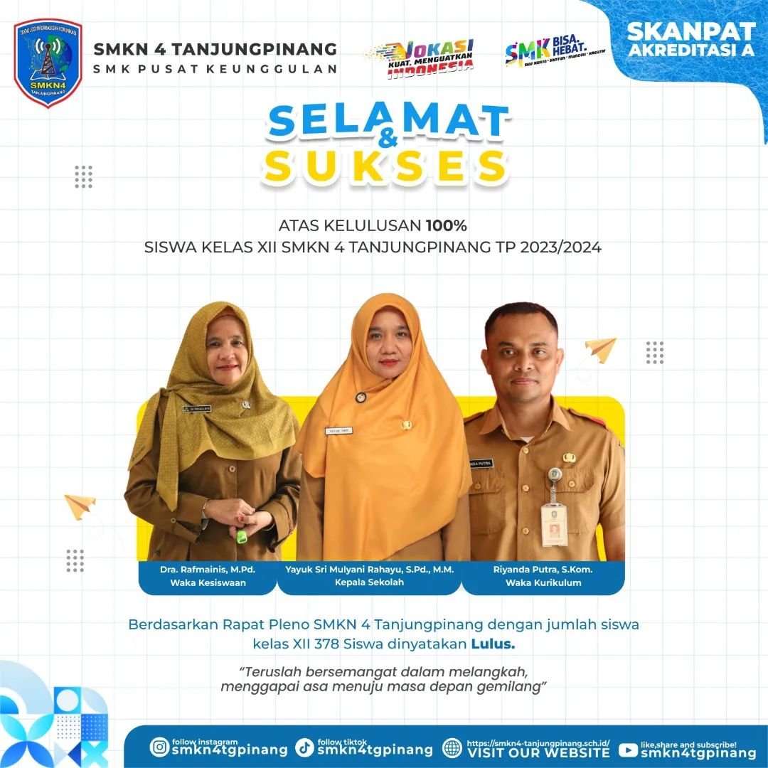 SMKN 4 TPI – Berdasarkan Rapat Pleno SMKN 4 Tanjungpinang dengan Jumlah siswa Kelas XII yaitu sebanyak 378 Siswa dinyatakan Lulus. Selamat