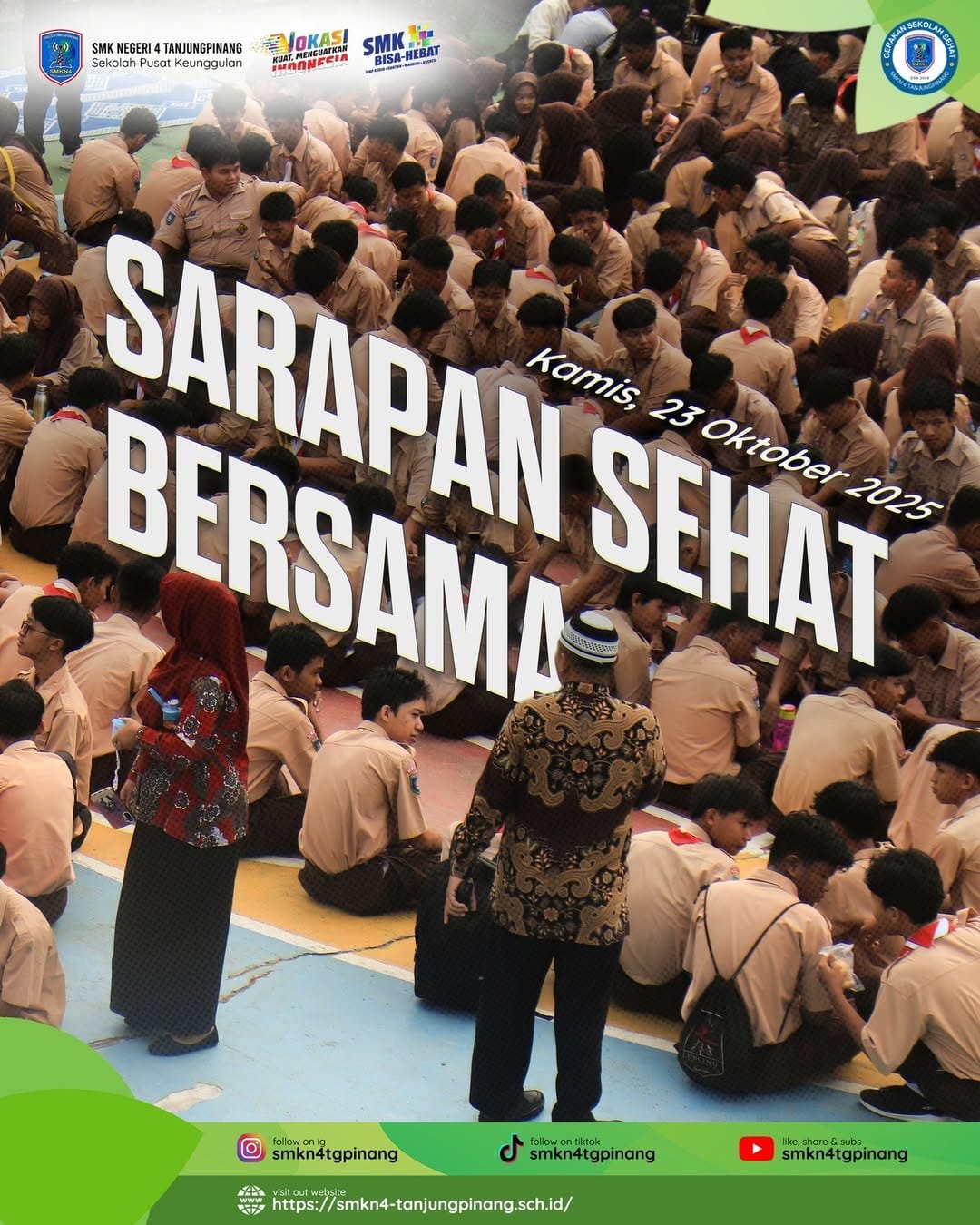 SMK Negeri 4 Tanjungpinang melaksanakan kegiatan sarapan sehat bersama yang diikuti seluruh Majelis Guru, Staf Tata Usaha dan Seluruh Siswa. Sarapan Sehat